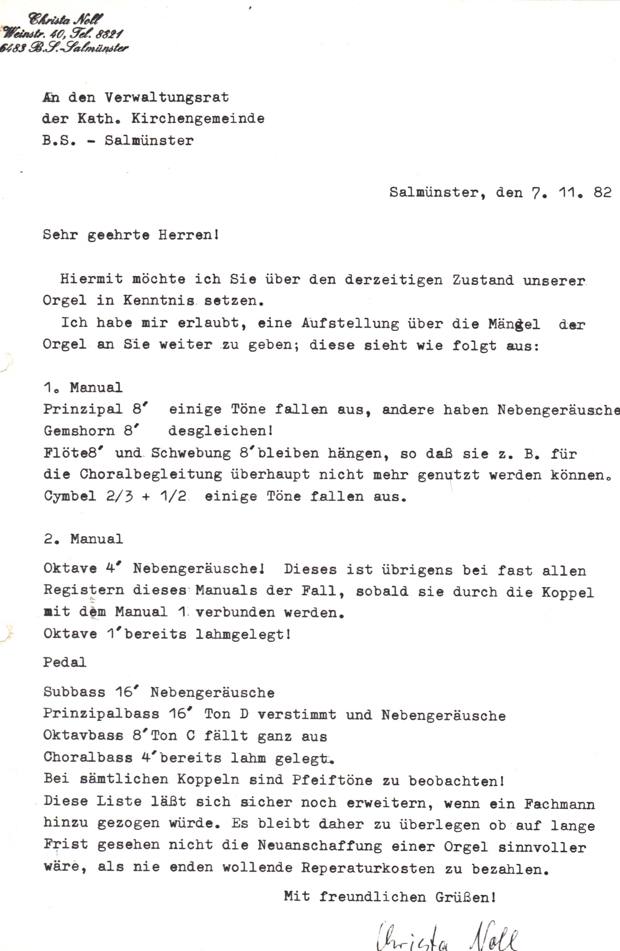 So durfte ich in der Ausgabe 1985/1 den Reigen eröffnen mit einer Bestandsaufnahme der alten Orgel. Schon im Jahr 1919 sei die pneumatische Traktur, also die Spielverbindung zwischen Tasten und Pfeifen mittels Druckluftröhren, eine fehleranfällige und pflegeintensive Konstruktion gewesen, die in ihrem heutigen Zustand dazu führe, dass Töne ungleichmäßig ansprechen und abklingen und oft hängenbleiben. Eine beachtliche Zahl von Registern, deren Auswahl ohnehin nicht optimal war, musste wegen dieser technischen Probleme bereits komplett stillgelegt werden. Das Pfeifenmaterial war wegen schlechter Wartung teils verbeult und unstimmbar geworden. So führte ich Mangel um Mangel auf und kam zu dem unweigerlichen Schluss, dass ein Neubau unumgänglich sei.